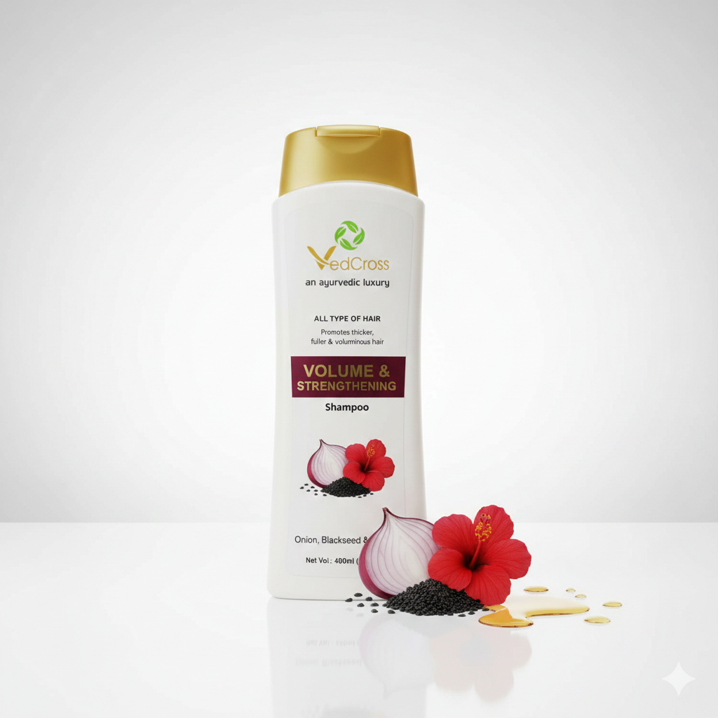 VedCross Ayurvedic Volume & Strengthening Shampoo An Ayurvedic luxury, this shampoo is formulated for all hair types to promote thicker, fuller, and more voluminous hair. Infused with natural powerhouses like Onion, Blackseed, and Hibiscus, it provides essential nourishment and strengthening.